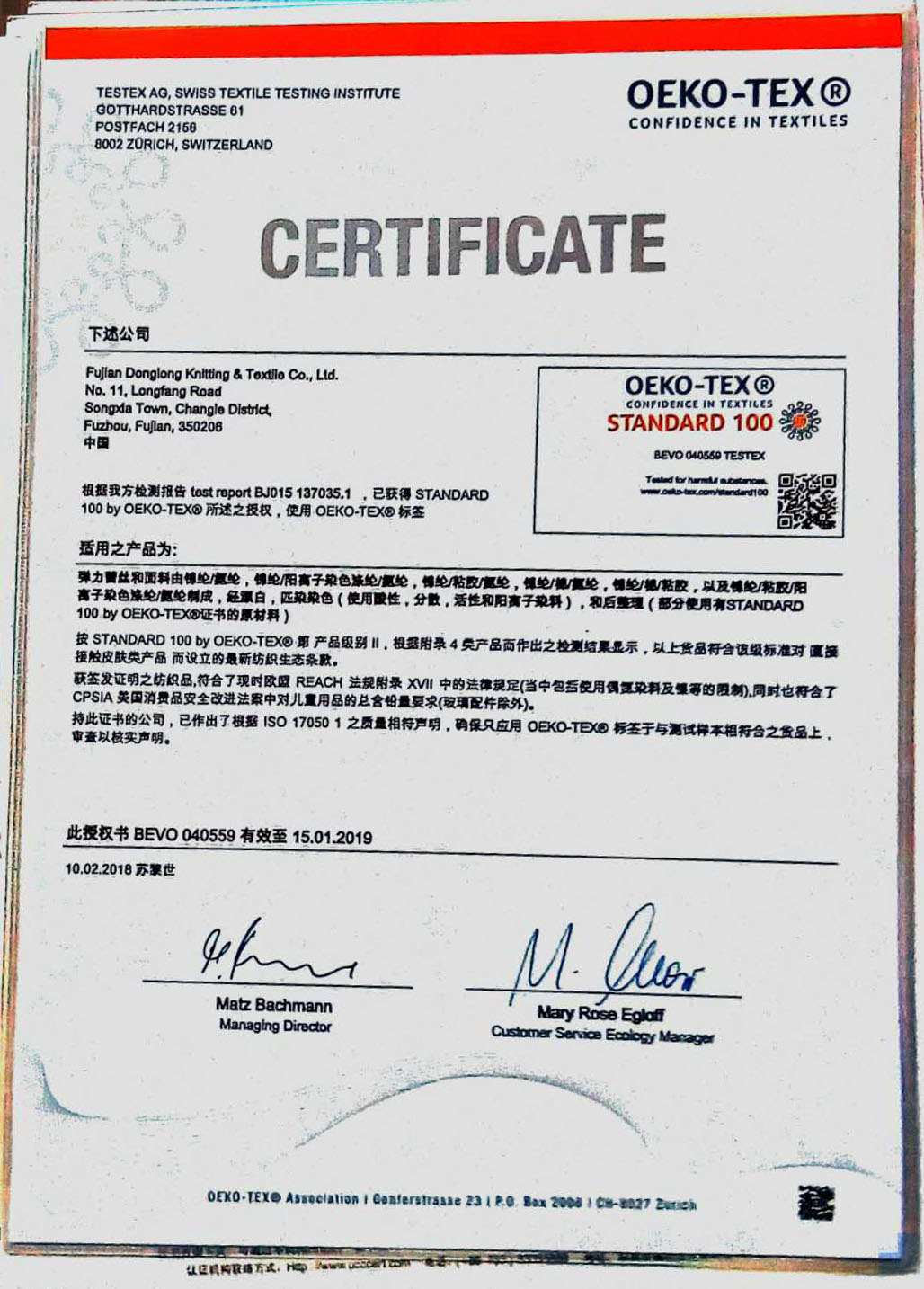 瑞士OEKO-TEX STANDARD 100生態紡織品認證證書/2018-09-04
